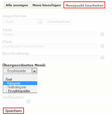 Um dem Menüpunkt "Kategorie" einen Unterpunkt hinzuzufügen, "Titel" eingeben, ebenfalls eine Beschreibung sowie den Pfad, das übergeordnete Menü auswählen -> speichern